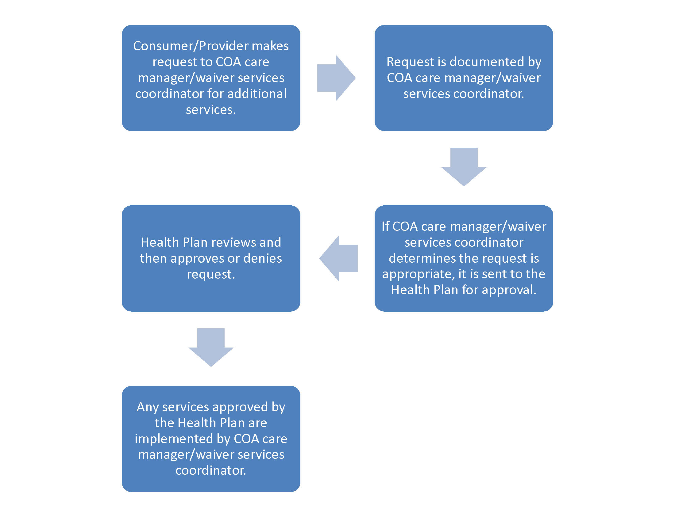 | Process to request additional/new waiver services for a MyCare Ohio consumer who is already enrolled in a waiver program such as PASSPORT, the Assisted Living Waiver or Ohio Home Care Waiver |