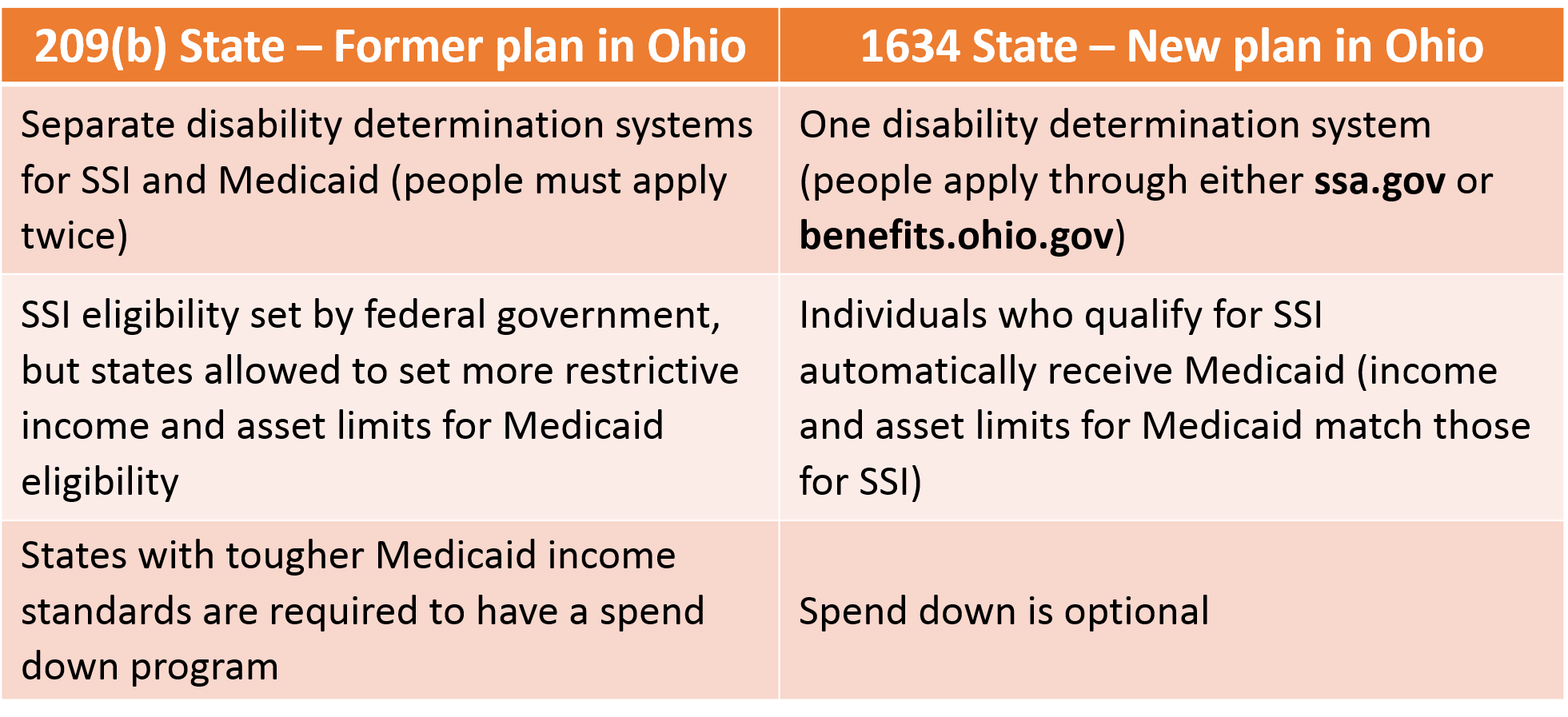 This summer, Ohio switched from a 209(b) state to a 1634 state. What does this mean? It means Ohio changed its disability determination system so that people who qualify for Supplemental Security Income (SSI) will also automatically qualify for Medicaid. As part of this change, Ohio has also decided to eliminate Medicaid spend-down and require beneficiaries to instead place excess income in a trust.