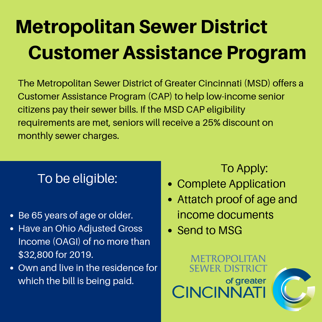 On August 1, the Metropolitan Sewer District of Greater Cincinnati (MSD) will begin offering a Customer Assistance Program (CAP) to help low-income senior citizens pay their sewer bills. The program will give seniors a 25-percent discount on their bill each month.