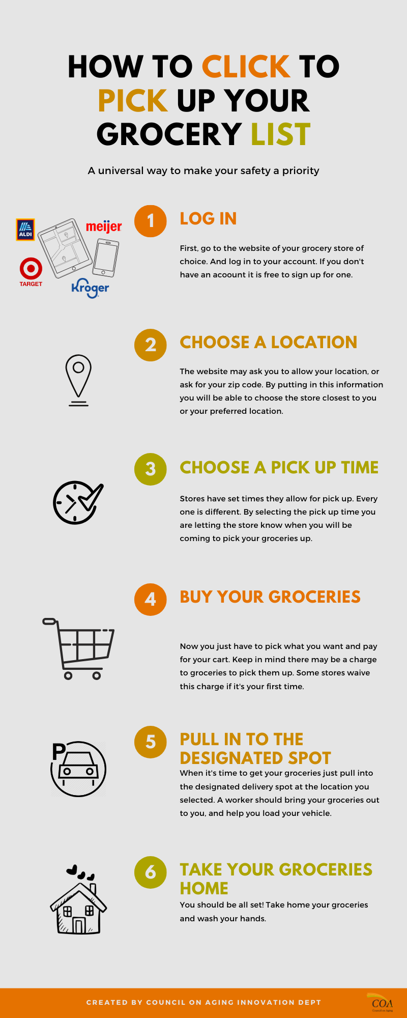 Most major grocers and retailers offer online grocery and supply ordering, either for pickup or delivery. Please note that during this time, these services are very busy and it may take several days to schedule delivery or pickup. We recommend planning ahead as much as possible.KrogerOnline OrderingWritten instructions for using Kroger Click List